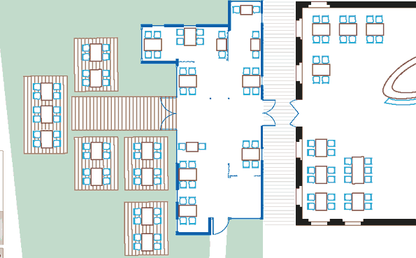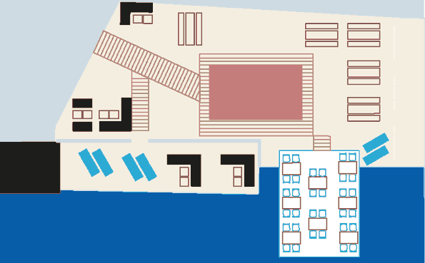 - 60 Plätze im Außenbereich auf Loungemöbeln, an Stehtischen mit Hochstühlen, Liegestühle und Bierbänke