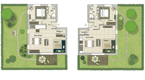 Die Erdgeschosse der Villen sind geprägt durch jeweils zwei 2-Raum-Wohnungen. Die Besonderheit bei diesen Wohnungen liegt in der Barrierefreiheit. Mit der großzügigen Terrasse, dem lichtdurchfluteten Wohn-/Essbereich und dem großzügigen Schlafzimmer ist gute Bewegungsfreiheit gewährleistet. Zur Wohnung gehört ein relativ nah gelegener, für Behinderte geeigneter Stellplatz. Für mehr Informationen sprechen Sie uns bitte an.