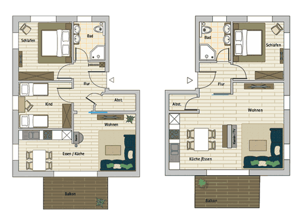 Im ersten Obergeschoß befinden sich jeweils zwei Wohnungen. Der Clou bei diesen Wohnungen ist, dass Sie selbst entscheiden können, ob Sie ein oder zwei Schlafräume benötigen. In den Wohnungen wird es einen offenen Wohn-/Essbereich mit Zugang zum Balkon geben. Das Bad ist mit einem Doppelwaschtisch und einer Dusche ausgestattet.